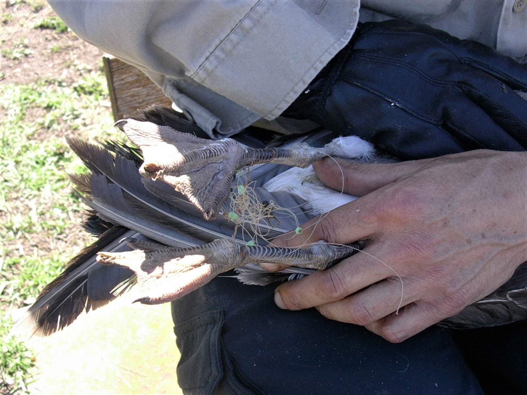Rubbish and fishing line entanglements around birds' feet and limbs can be fatal for many reasons, including infection and trapping.